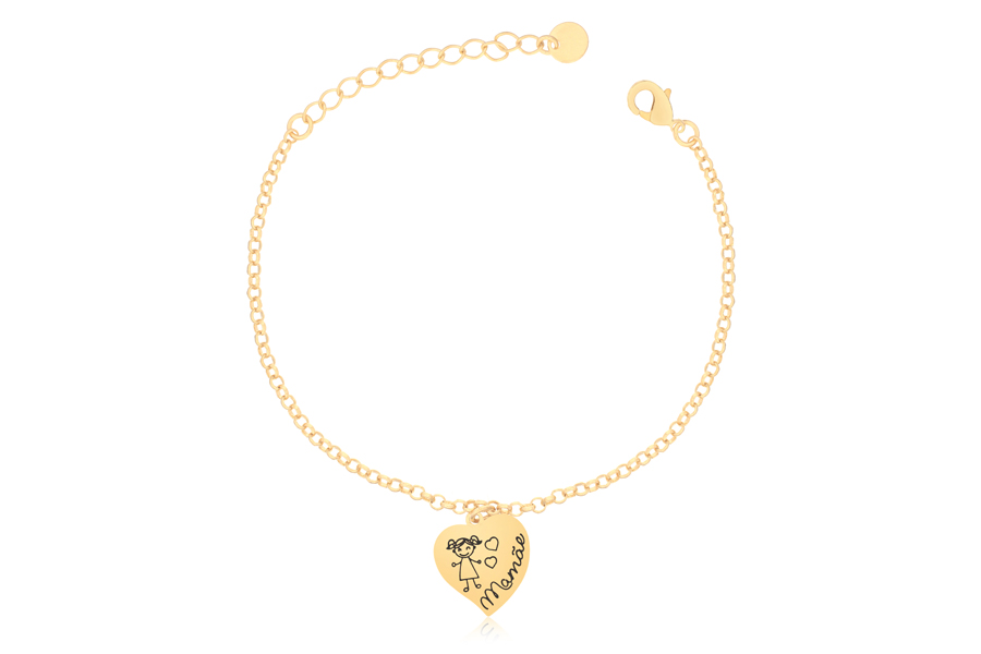 PULSEIRA BANHADA EM OURO, ELO PORTUGUÊS 3mm, ELO CORAÇÃO 4,20mm LARGURA, PINGENTE CORAÇÃO 11mm LARGURA COM MENINA