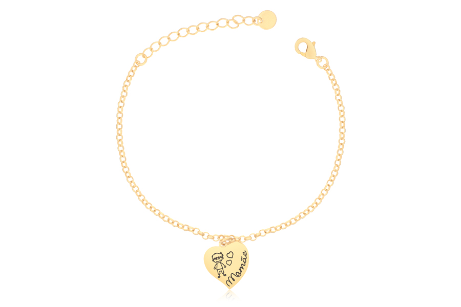 PULSEIRA BANHADA EM OURO, ELO PORTUGUÊS 3mm, ELO CORAÇÃO 4,20mm LARGURA, PINGENTE CORAÇÃO 11mm LARGURA COM MENINO