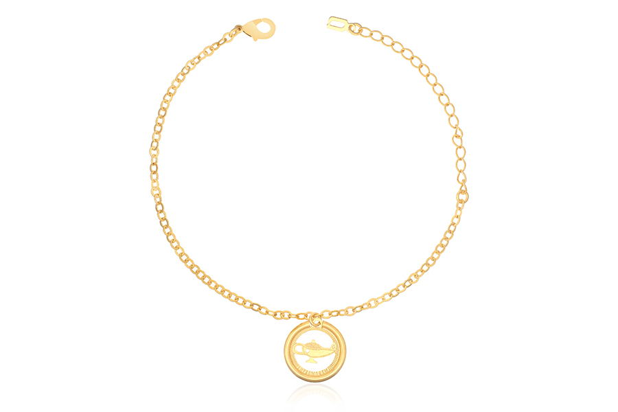 PULSEIRA BANHADA EM OURO, ELO PORTUGUÊS 2,50mm, 16cm COMPRIMENTO, PONTO DE LUZ 4,50mm E PINGENTE PAZ 11mm DIÂMETRO