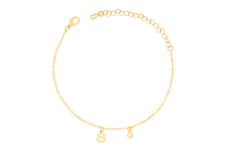 PULSEIRA INFANTIL BANHADA EM OURO, ELO DUPLO 1,80mm E CARTIER 3,50x1,90mm, 15cm COMPRIMENTO, CORAÇAO, ANJO E CHAVE