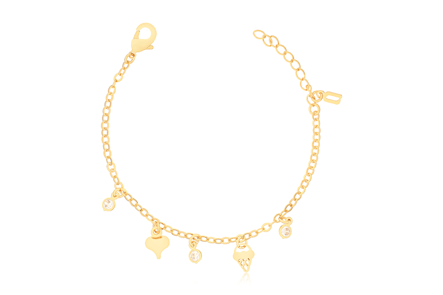 PULSEIRA BANHADA EM OURO, ELO OVAL 9,50x6,50mm, CORAÇÃO 9mm LARGURA, E SAPATO 15mm COMPRIMENTO