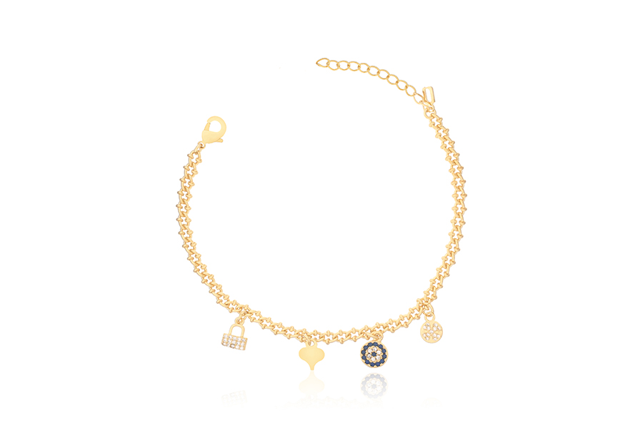 PULSEIRA INFANTIL BANHADA EM OURO, ELO DUPLO 1,80mm E CARTIER 3,50x1,90mm, 15cm COMPRIMENTO, CORAÇAO, ANJO E CHAVE