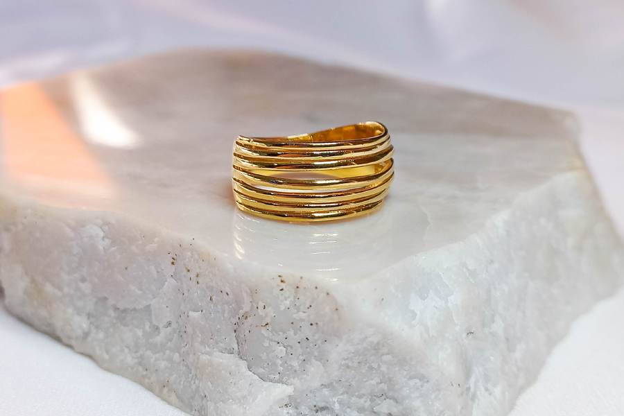 ANEL BANHADO EM OURO, FIOS CRUZADOS, 12mm LARGURA