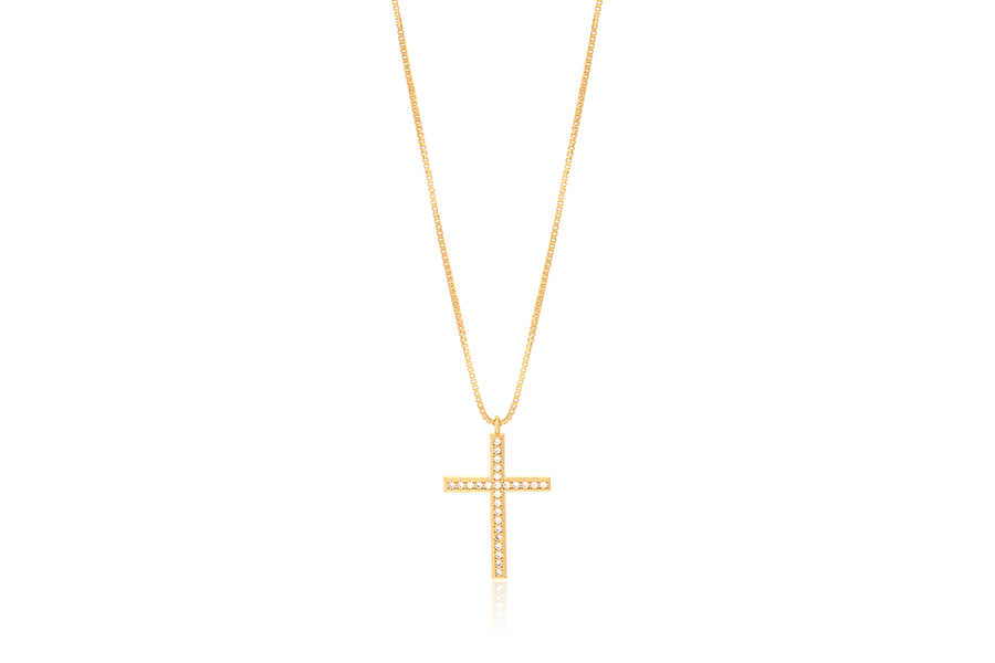 GARGANTILHA BANHADA EM OURO, ELO 1,50mm LARGURA, 60cm COMPRIMENTO E PINGENTE OVAL 18X11mm COM DUAS CRUZES