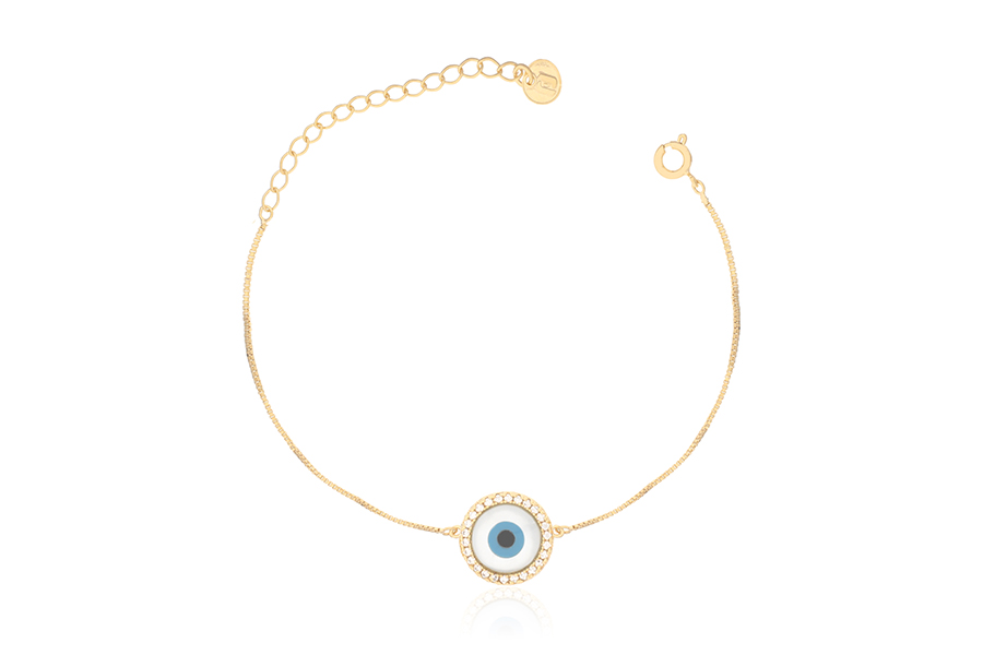PULSEIRA BANHADA EM OURO, OLHO GREGO 11mm DIÂMETRO, QUALQUER COR, ELO VENEZIANA 0,80mm, LINHA TRADICIONAL