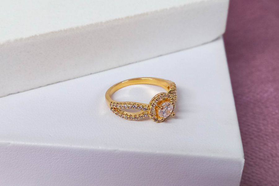 ANEL BANHADO EM OURO, SOLITÁRIO 5mm COM 22 ZIRCÔNIAS