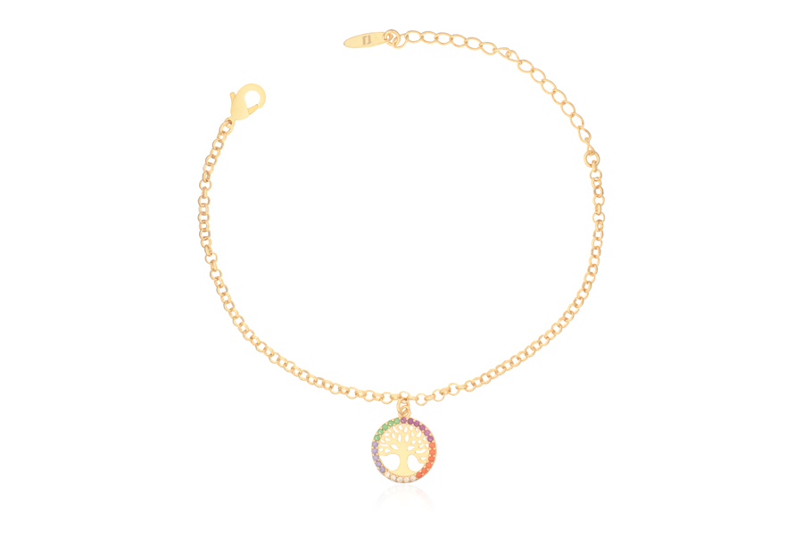 PULSEIRA BANHADA EM OURO, ELO PORTUGUÊS 5mm DIÂMETRO, 17cm COMPRIMENTO, EXTENSOR 5cm COMPRIMENTO E ÁRVORE DA VIDA 21mm DIÂMETRO