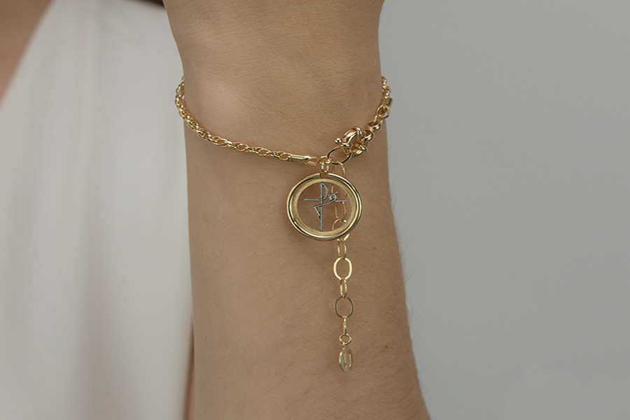 PULSEIRA BANHADA EM OURO, ELO PORTUGUÊS 2,50mm, 16cm COMPRIMENTO, PONTO DE LUZ 4,50mm E PINGENTE FÉ 11mm DIÂMETRO