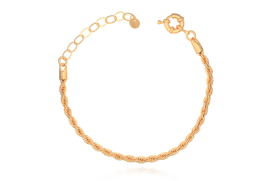 PULSEIRA BANHADA EM OURO, CORRENTE ELO CORDA 3mm, 17cm COMPRIMENTO, EXTENSOR 5cm COMPRIMENTO E PESO 5,30g