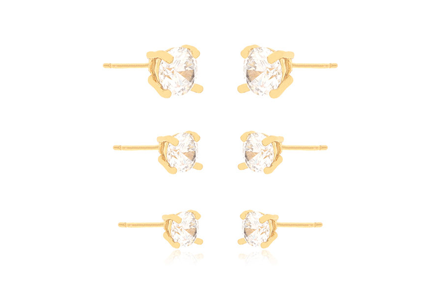 CONJUNTO BANHADO EM OURO TRIO DE BRINCOS CORAÇÃO, ZIRCÔNIAS 4X4mm, PARA QUALQUER COR DE PEDRA