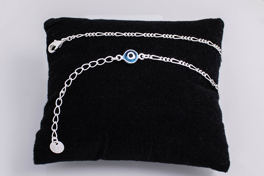 TORNOZELEIRA BANHADA EM RÓDIO BRANCO, ELO PORTUGUÊS 2,50mm ESPESSURA, 22cm COMPRIMENTO, OLHO GREGO 5mm LARGURA E PONTO DE LUZ 3,50mm DIÂMETRO