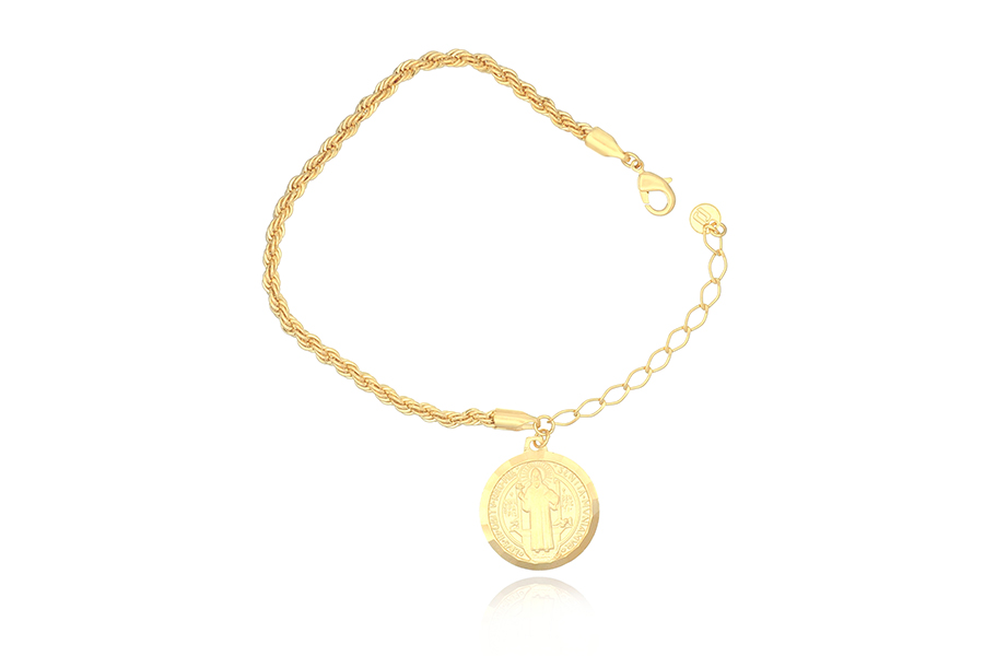 PULSEIRA BANHADA EM OURO, ELO PORTUGUÊS 2,50mm, 16cm COMPRIMENTO, PONTO DE LUZ 4,50mm E PINGENTE FÉ 11mm DIÂMETRO