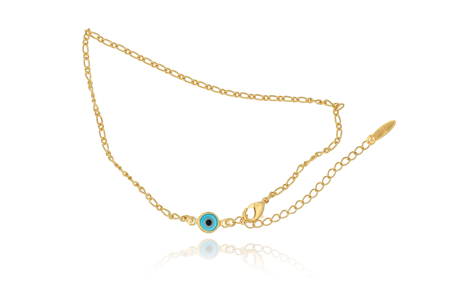 TORNOZELEIRA BANHADA EM RÓDIO BRANCO, ELO PORTUGUÊS 2,50mm ESPESSURA, 22cm COMPRIMENTO, OLHO GREGO 5mm LARGURA E PONTO DE LUZ 3,50mm DIÂMETRO