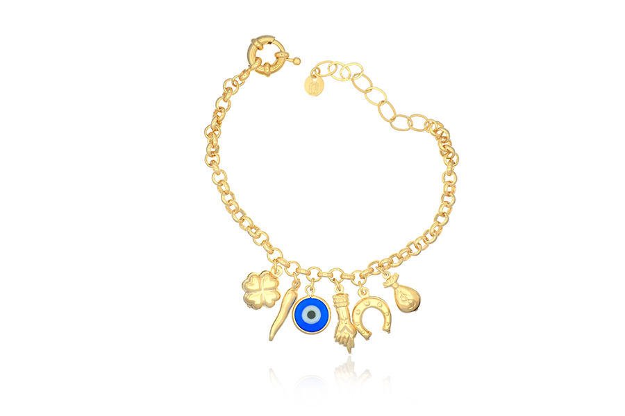 PULSEIRA BANHADA EM OURO, CRISTAL, ELO PORTUGUÊS 7mm DIÂMETRO, 1,90mm ESPESSURA E PINGENTE BONECOS 20mm DIÂMETRO