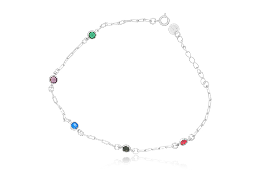 TORNOZELEIRA EM PRATA, ZIRCÔNIAS REDONDAS COLORIDAS, ELO VENEZIANA 24+4cm