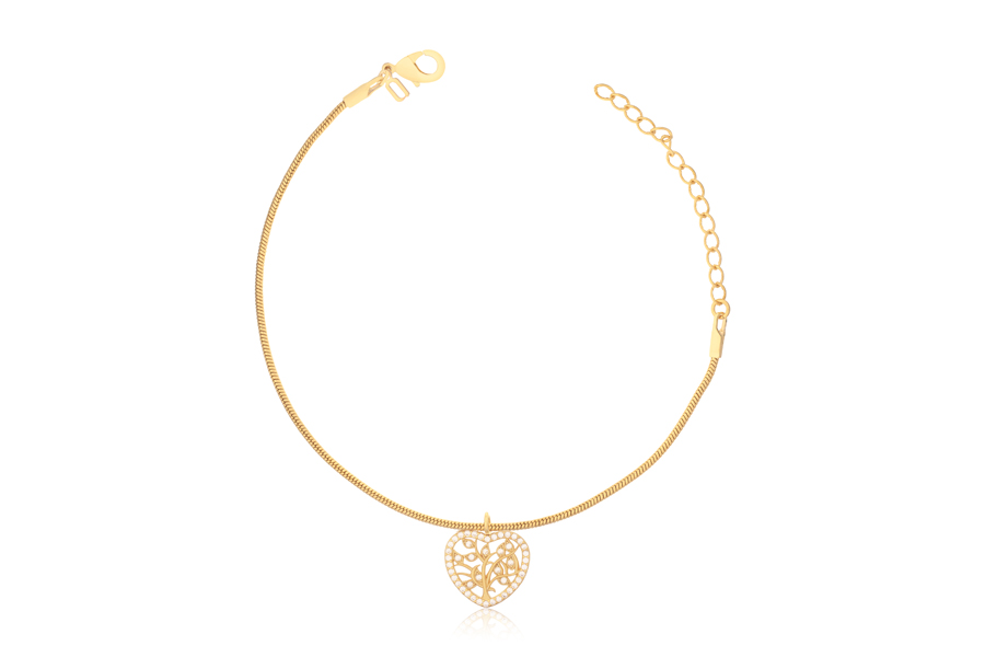PULSEIRA BANHADA EM OURO, ELO OVAL 9,50x6,50mm, CORAÇÃO 9mm LARGURA, E SAPATO 15mm COMPRIMENTO