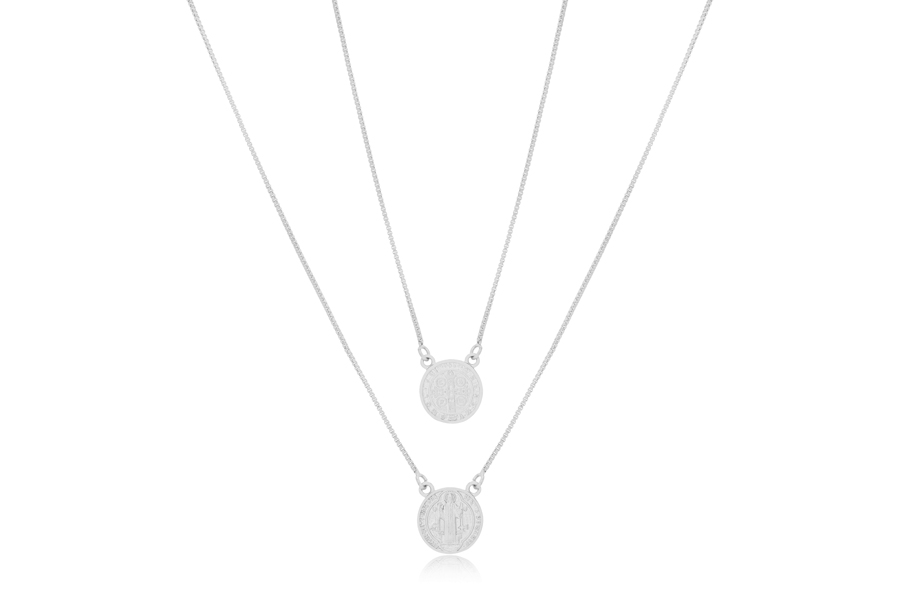 ESCAPULÁRIO EM PRATA, SAGRADO CORAÇÃO DE JESUS E NOSSA SENHORA DO CARMO, RETANGULAR 9,50mm LARGURA, ELO GRUMET, 60cm COMPRIMENTO