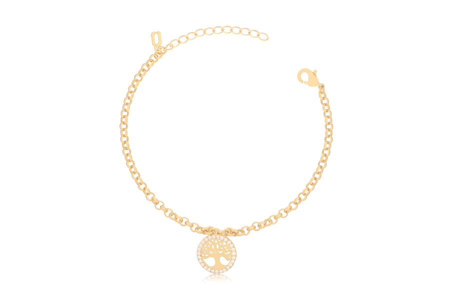 PULSEIRA BANHADA EM OURO, ELO PORTUGUÊS 2,50mm, 16cm COMPRIMENTO, PONTO DE LUZ 4,50mm E PINGENTE PAZ 11mm DIÂMETRO