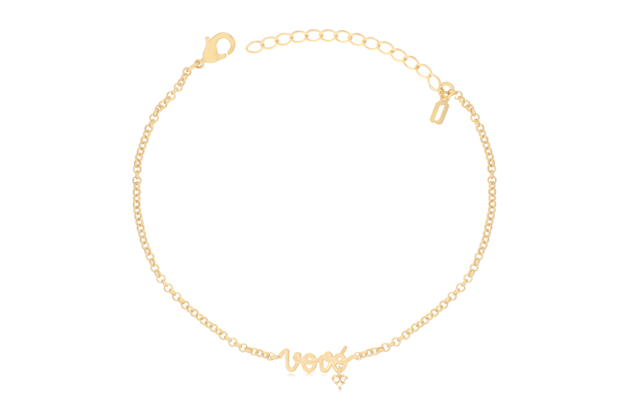 PULSEIRA BANHADA EM OURO, ESCRITA ''VOVÓ'' E CORAÇÃO CRAVEJADO 6,50mm LARGURA, ELO PORTUGUÊS 2,50mm DIÂMETRO