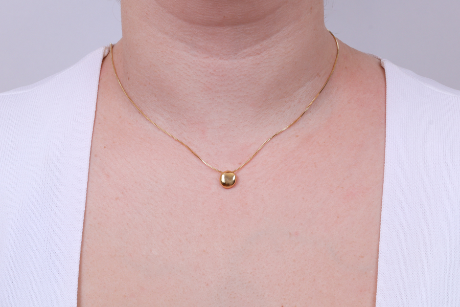 CHOKER BANHADO EM OURO, ELO 1,50mm, 35cm COMPRIMENTO, EXTENSOR 10cm COMPRIMENTO E PINGENTE OVAL IRREGULAR 8,50mm COMPRIMENTO, LISO OU ACETINADO
