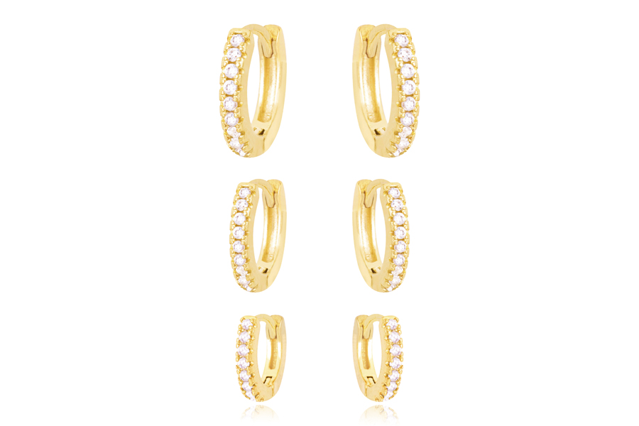 BRINCO EM PRATA, ARGOLINHA COM 3 FILEIRAS DE ZIRCÔNIAS, MEIO CRAVEJADA, 3,40mm LARGURA E 12,30mm DIÂMETRO