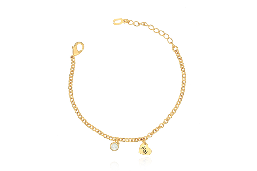 PULSEIRA BANHADA EM OURO, ELO OVAL 9,50x6,50mm, CORAÇÃO 9mm LARGURA, E SAPATO 15mm COMPRIMENTO