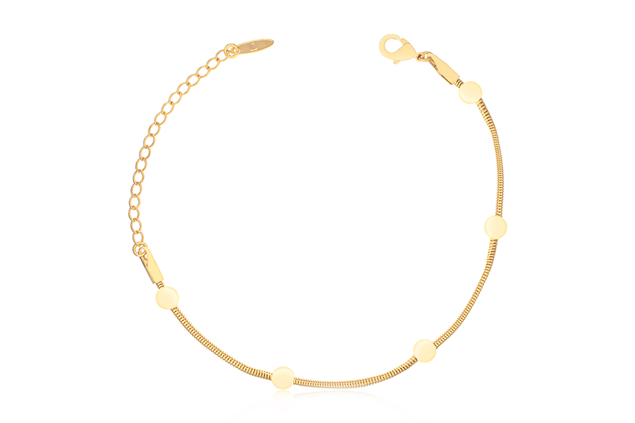 PULSEIRA BANHADO EM OURO BRACELETE INFANTIL 3mm LARGURA 550cm COMPRIMENTO COM PÉROLA SHELL 6mm DIÂMETRO E 10 ARGOLINHAS