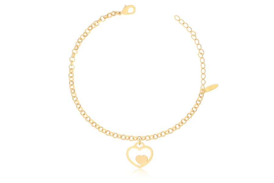 PULSEIRA BANHADA EM OURO, ELO OVAL 9,50x6,50mm, CORAÇÃO 9mm LARGURA, E SAPATO 15mm COMPRIMENTO