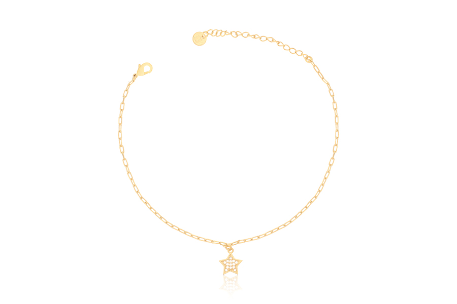 TORNOZELEIRA BANHADA EM OURO, ELO PORTUGUÊS 3mm, 22cm COMPRIMENTO E PONTO DE LUZ 8mm