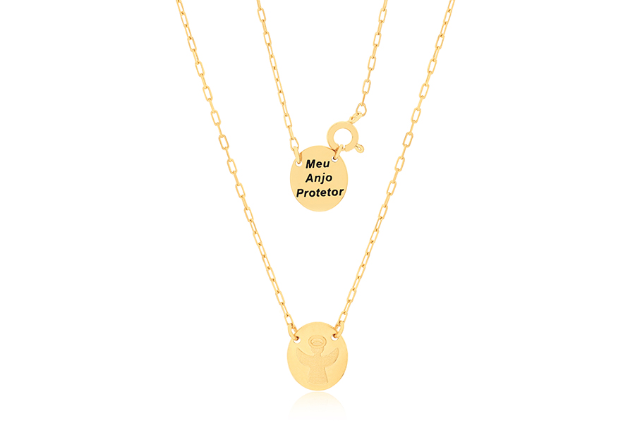 GARGANTILHA BANHADO EM OURO, INFANTIL, ESCAPULÁRIO, ELO CARTIER 3x1,40mm, 44cm COMPRIMENTO, MEDALHA OVAL 12x11mm ANJO E MEU ANJO PROTETOR