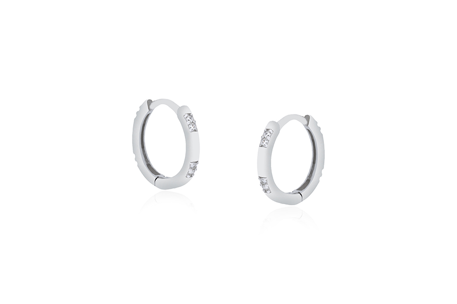 BRINCO BANHADO EM RÓDIO BRANCO, ARGOLINHA 14mm DIÂMETRO, 10mm LARGURA COM 5 ZIRCÔNIAS