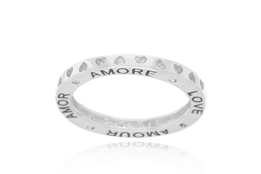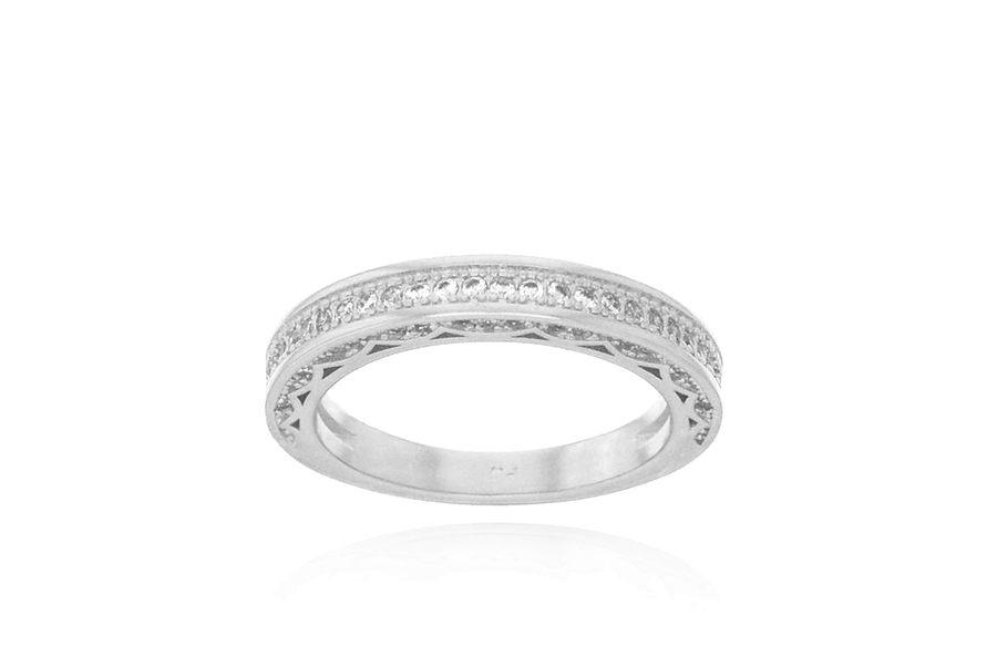 ANEL EM PRATA, ALIANÇA, 58 ZIRCÔNIAS, COM CORAÇÕES NAS BORDAS, 2mm LARGURA