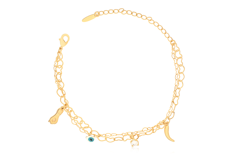 PULSEIRA BANHADA EM OURO, ELO 4mm LARGURA, PIMENTA, CORAÇÃO, CRUZ, OLHO GREGO E PONTO DE LUZ