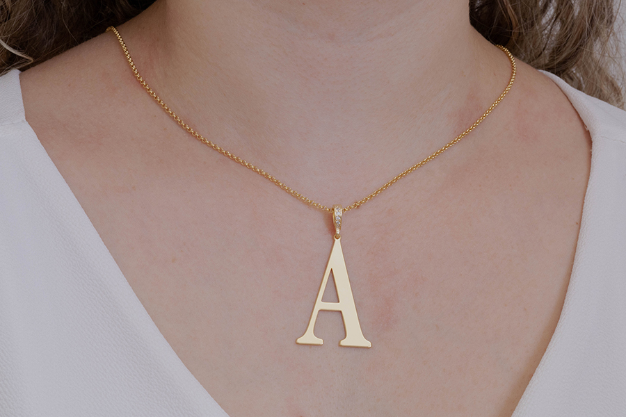PINGENTE BANHADO EM OURO, LETRA A, 53mm ALTURA, BASE CRAVEJADA