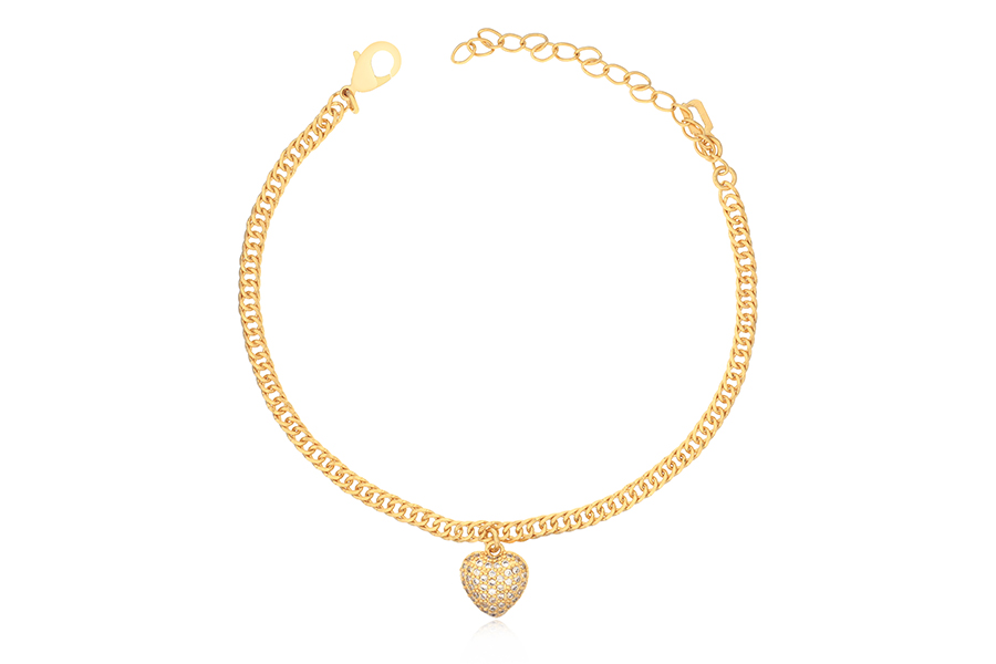 PULSEIRA BANHADA EM OURO, ELO 2,30mm LARGURA, 16cm COMPRIMENTO, EXTENSOR 5cm COMPRIMENTO E CORAÇÃO 7mm LARGURA, PARA QUALQUER COR