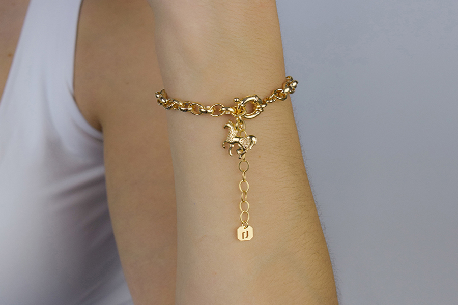 PULSEIRA BANHADA EM OURO, CRISTAL, ELO PORTUGUÊS 7mm DIÂMETRO, 1,90mm ESPESSURA E PINGENTE BONECOS 20mm DIÂMETRO