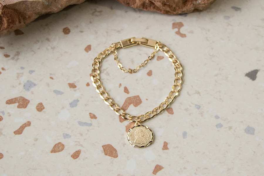 PULSEIRA BANHADA EM OURO, ELO PORTUGUÊS 2,50mm, 16cm COMPRIMENTO, PONTO DE LUZ 4,50mm E PINGENTE FÉ 11mm DIÂMETRO