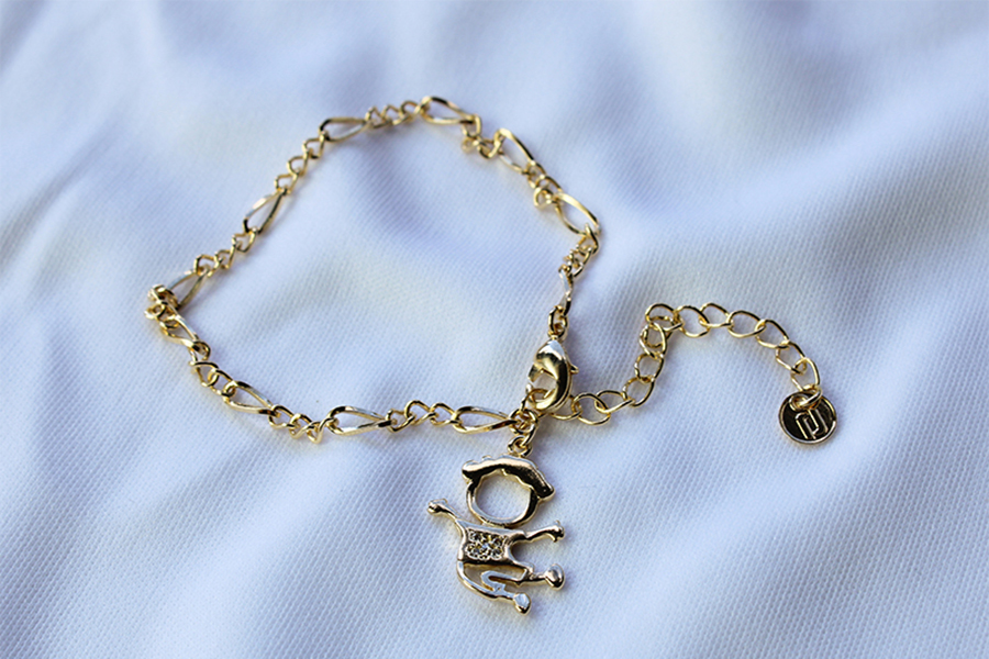 PULSEIRA BANHADA EM OURO, CRISTAL, ELO PORTUGUÊS 7mm DIÂMETRO, 1,90mm ESPESSURA E PINGENTE BONECOS 20mm DIÂMETRO