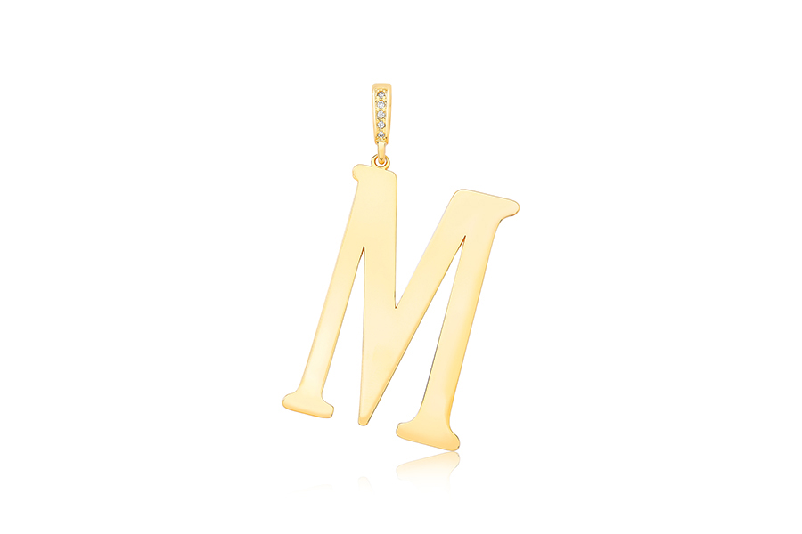 PINGENTE BANHADO EM OURO, LETRA M, 53mm ALTURA, BASE CRAVEJADA