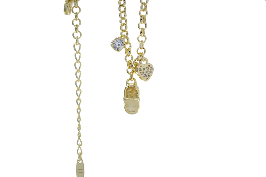 PULSEIRA BANHADA EM OURO, ELO OVAL 9,50x6,50mm, CORAÇÃO 9mm LARGURA, E SAPATO 15mm COMPRIMENTO