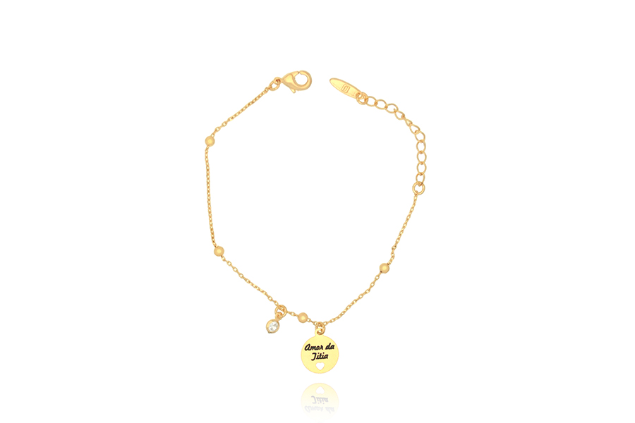PULSEIRA INFANTIL BANHADA EM OURO, ELO 1,10mm COM BOLINHA, 14cm COMPRIMENTO, PONTO DE LUZ 3,50mm, AMOR DA DINDA 10mm COM CORAÇÃO