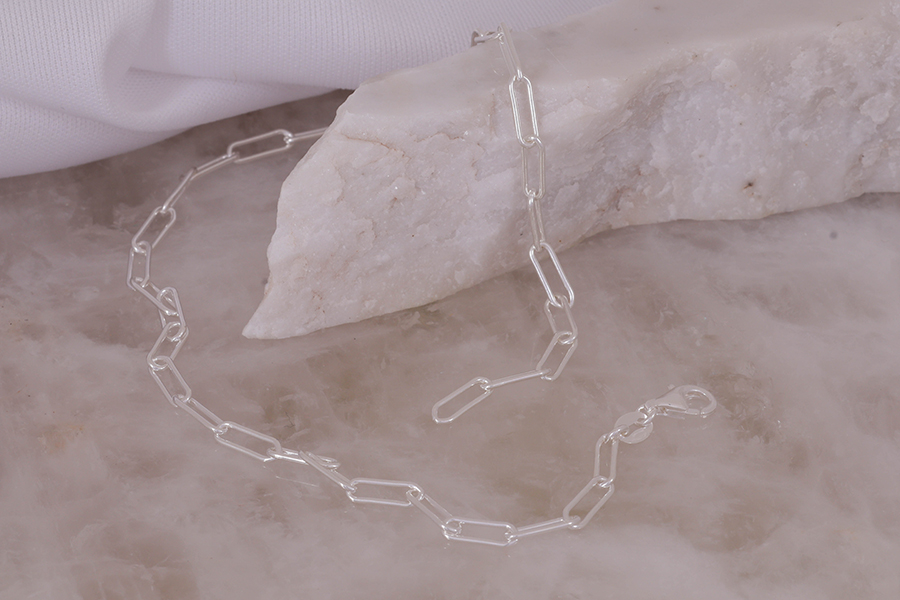 CORRENTE EM PRATA, ELO CANUTILHO E ESFERA TRANÇADO E DIAMANTADO, 3,20mm LARGURA E 2,20mm ESPESSURA, 45cm COMPRIMENTO