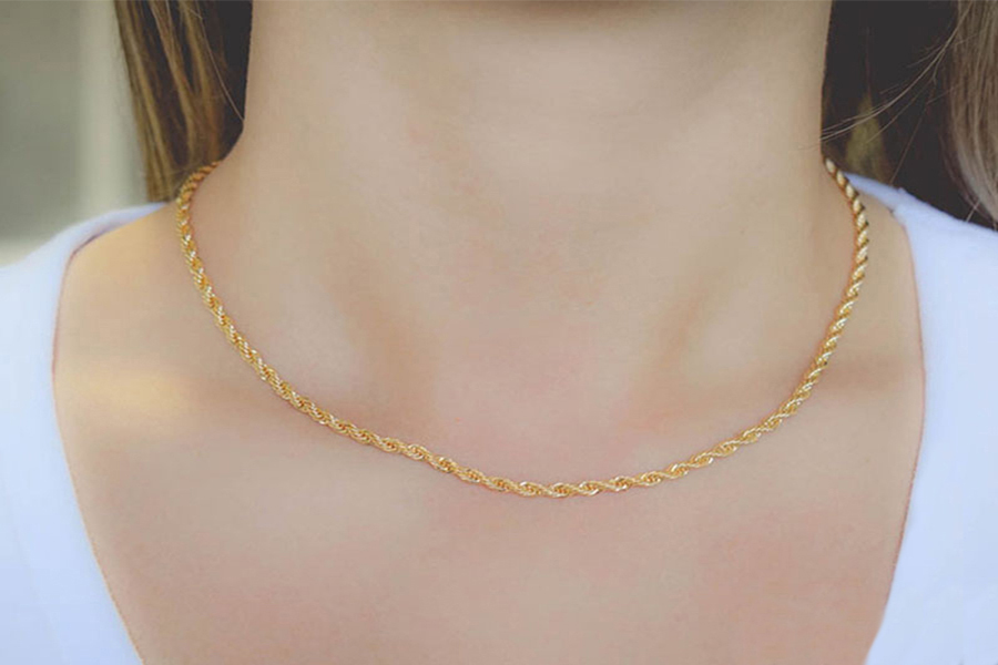 CORRENTE BANHADA EM OURO, ELO CORDA 3mm, 45cm COMPRIMENTO, EXTENSOR 5cm COMPRIMENTO E PESO 12,20g