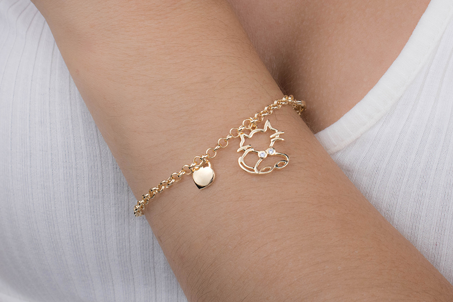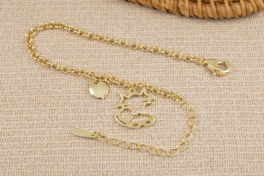 PULSEIRA BANHADA EM OURO, ELO PORTUGUÊS 3mm DIÂMETRO, CORAÇÃO 7mm LARGURA E GATO 16mm ALTURA