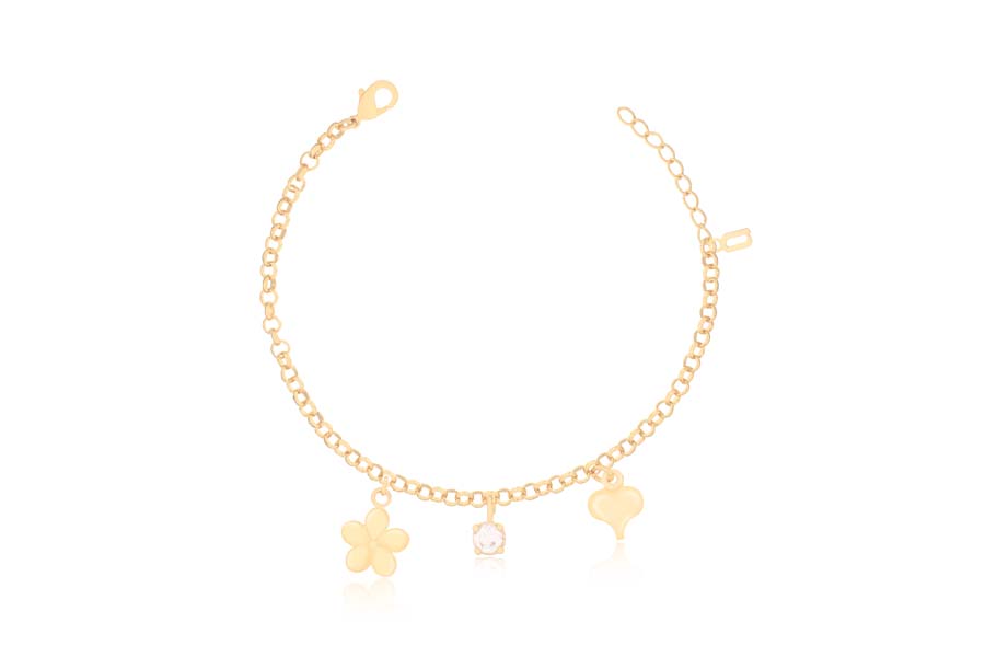 PULSEIRA BANHADA EM OURO, ELO OVAL 9,50x6,50mm, CORAÇÃO 9mm LARGURA, E SAPATO 15mm COMPRIMENTO