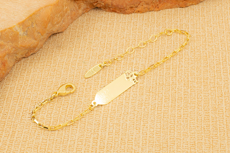PULSEIRA INFANTIL BANHADA EM OURO, VENEZIANA LONGA 1,50mm ESPESSURA E CHAPINHA COM MENINA 24mm COMPRIMENTO