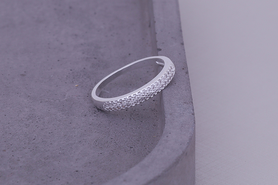 ANEL EM PRATA, MEIA ALIANÇA COM DUAS FILEIRAS DE ZIRCÔNIAS, 2,30mm LARGURA