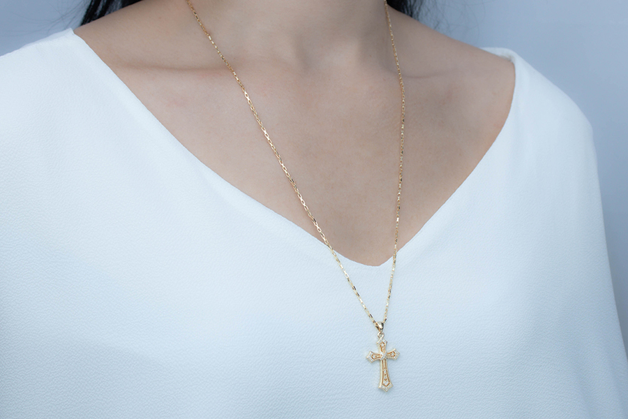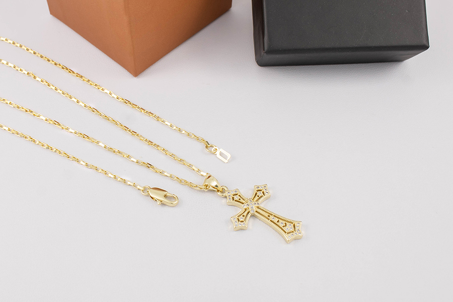 GARGANTILHA BANHADA EM OURO, ELO 2,30mm LARGURA, 60cm DE COMPRIMENTO E PINGENTE RETANGULAR CRUZ 15X11mm
