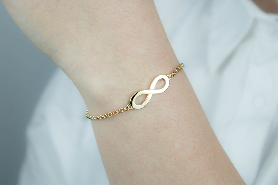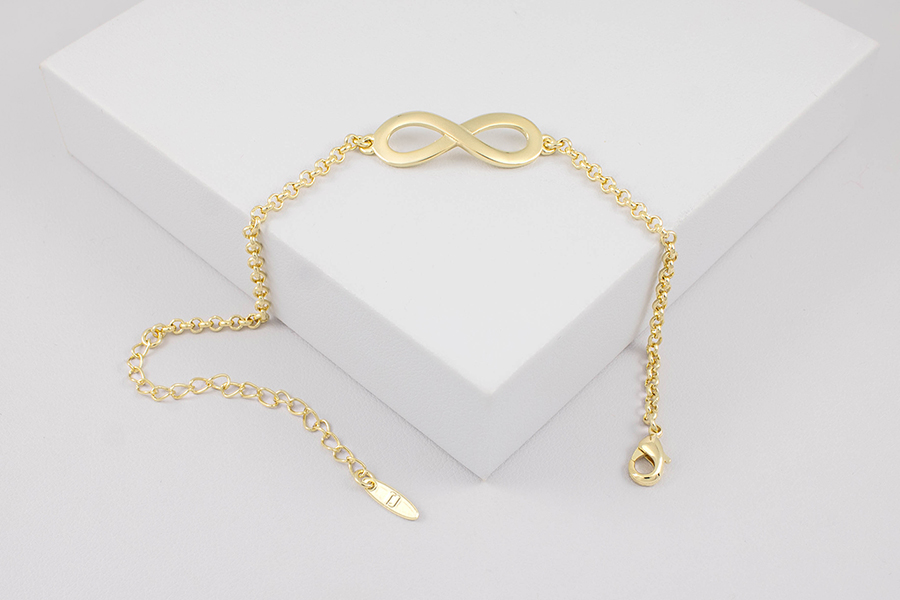 PULSEIRA BANHADA EM OURO, INFINITO 19mm LARGURA, PONTO DE LUZ 3mm, ELO VENEZIANA 0,80mm, 15cm E 16cm COMPRIMENTO