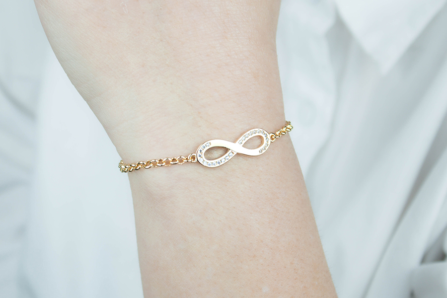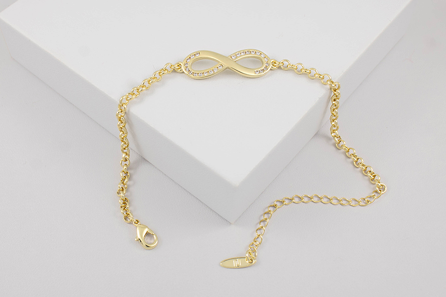 PULSEIRA BANHADA EM OURO, INFINITO 19mm LARGURA, PONTO DE LUZ 3mm, ELO VENEZIANA 0,80mm, 15cm E 16cm COMPRIMENTO